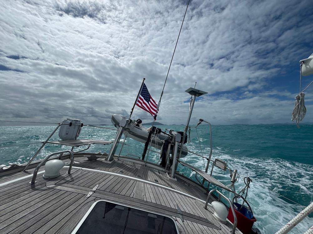 The next morning, we set off for Virgin Gorda under clear skies. Sailing up the Drake Channel was exhilarating, with crisp tacks and steady strong wind. But as we approached the island’s west coast, conditions shifted dramatically. Skies darkened, swells built, and heavy rain fell. We quickly furled the sails and motored upwind toward the shelter of Gorda Sound, joining a line of boats doing the same.